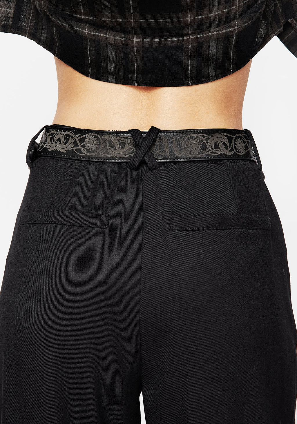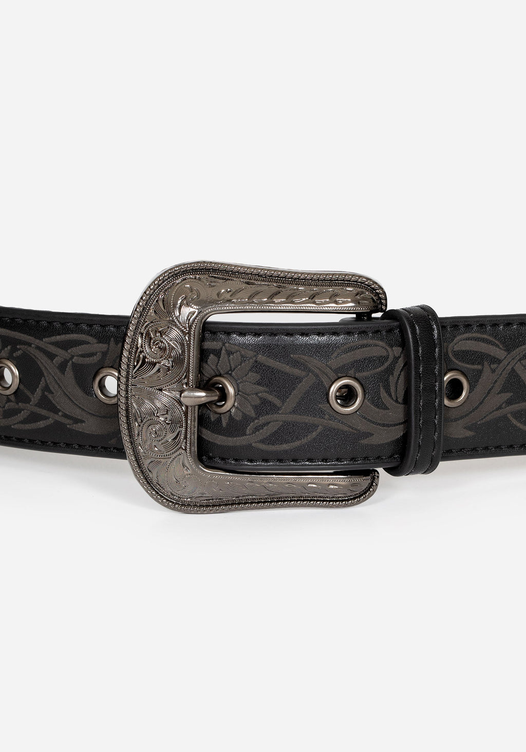 - Silver belt buckle features Celtic inspired design for an elegant touch