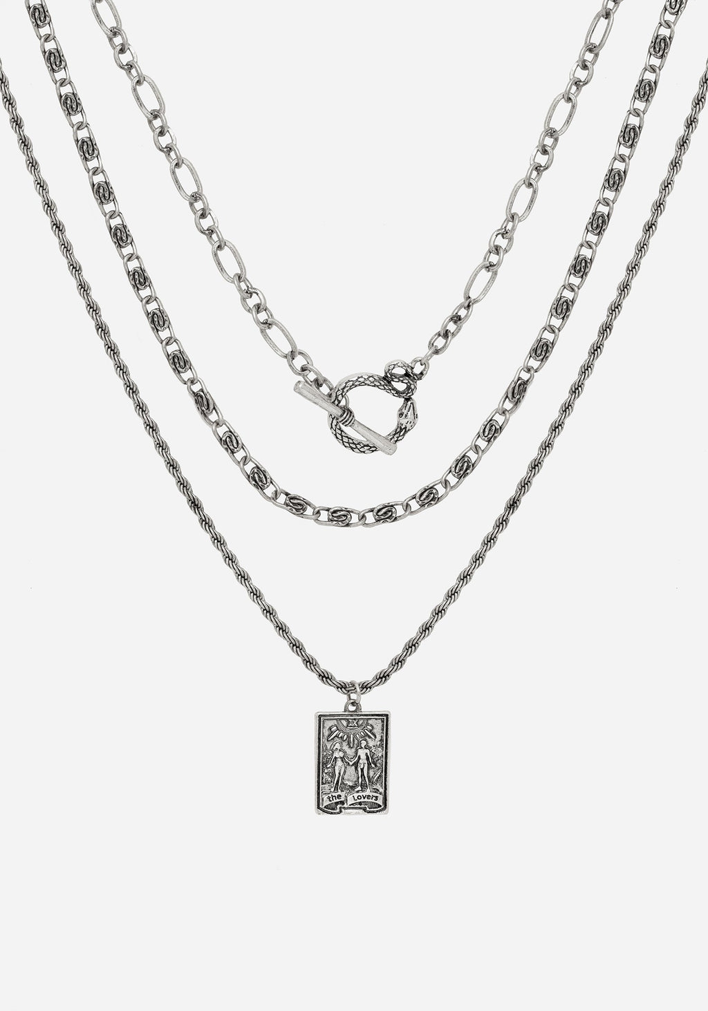 A mystical silver mixed chain pendant necklace featuring rope, figaro & twisted chains for a dimensional finish. A silver ouroboros snake T-bar fastening embellishes its shortest chain, while an intricate The Lovers tarot card charm completes this statement piece.