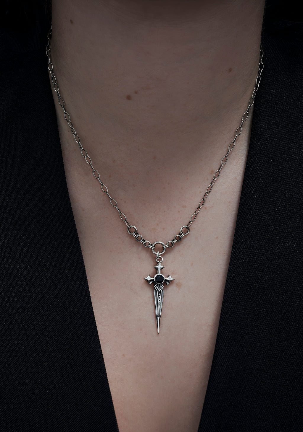 • Sterling Silver Necklace with Sword Detail & Black Spinel Stone