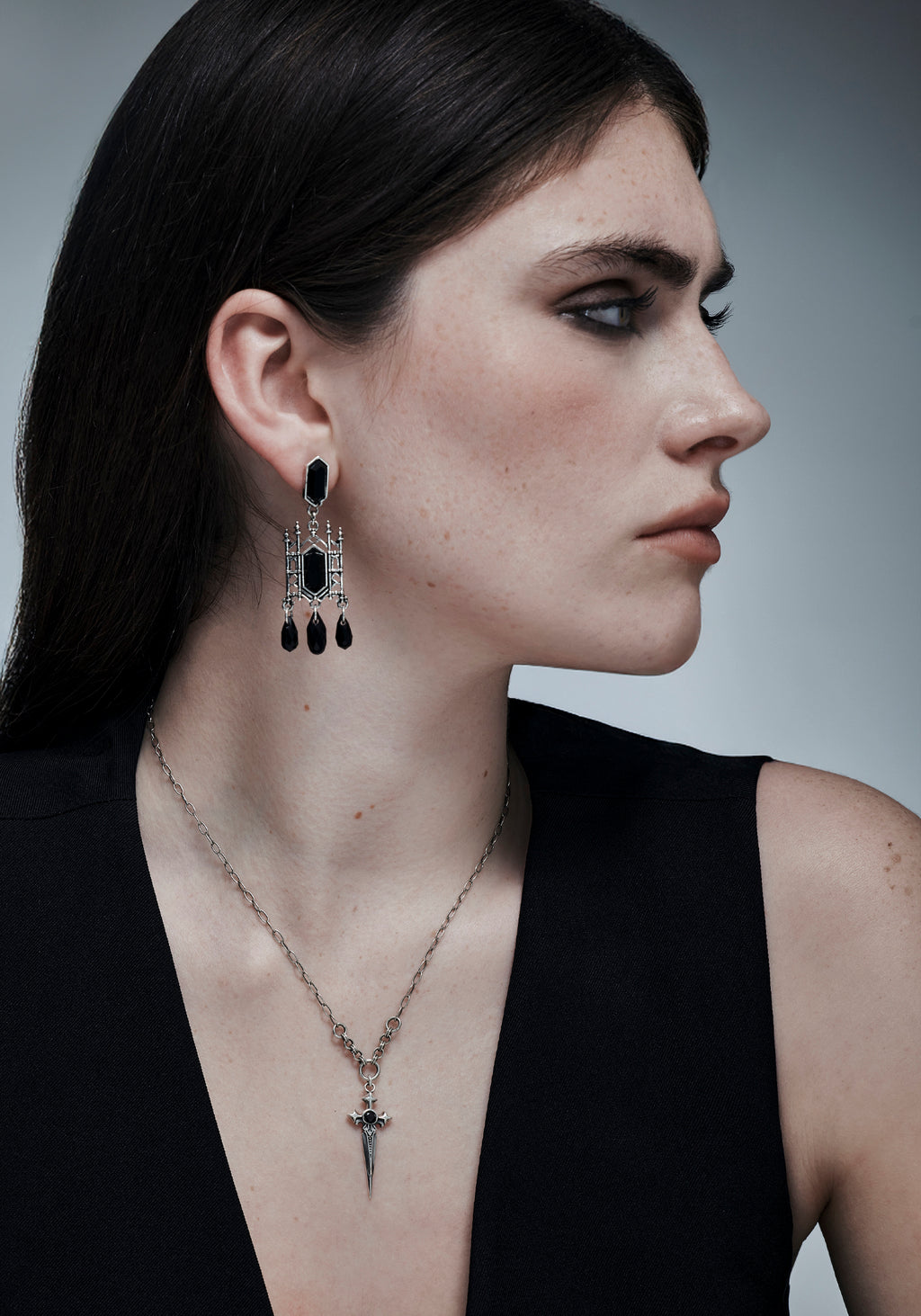 A love marked by blade, by cross, by midnight stone… the Forevermore collection unveils a sterling silver necklace featuring sword detailing with a black spinel stone, capturing gothic elegance and symbolic devotion.